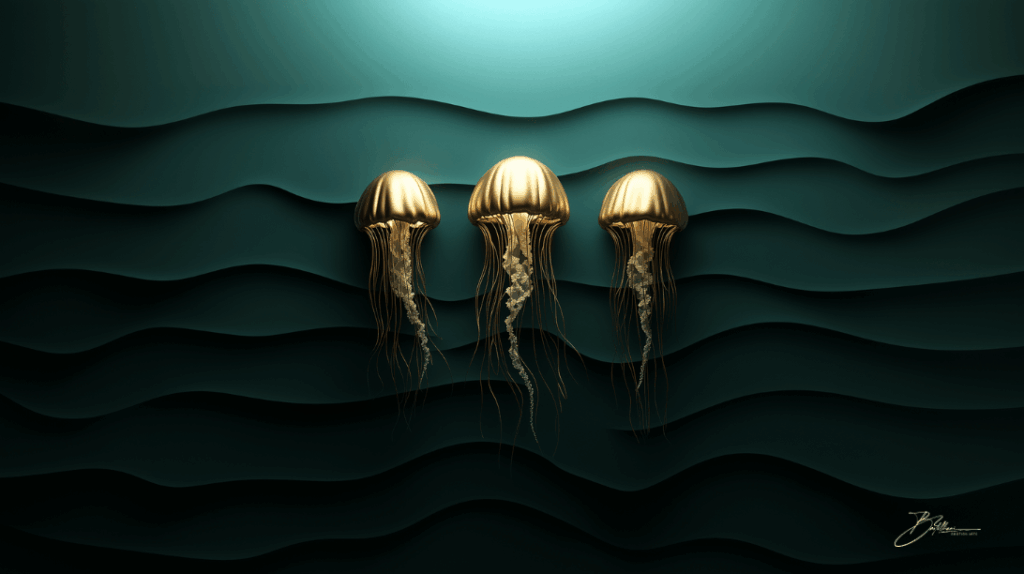 The jellyfish in this piece float like golden crowns through the depths, their glowing tentacles trailing streams of light. Surrounded by wave-like shapes and luminous accents,