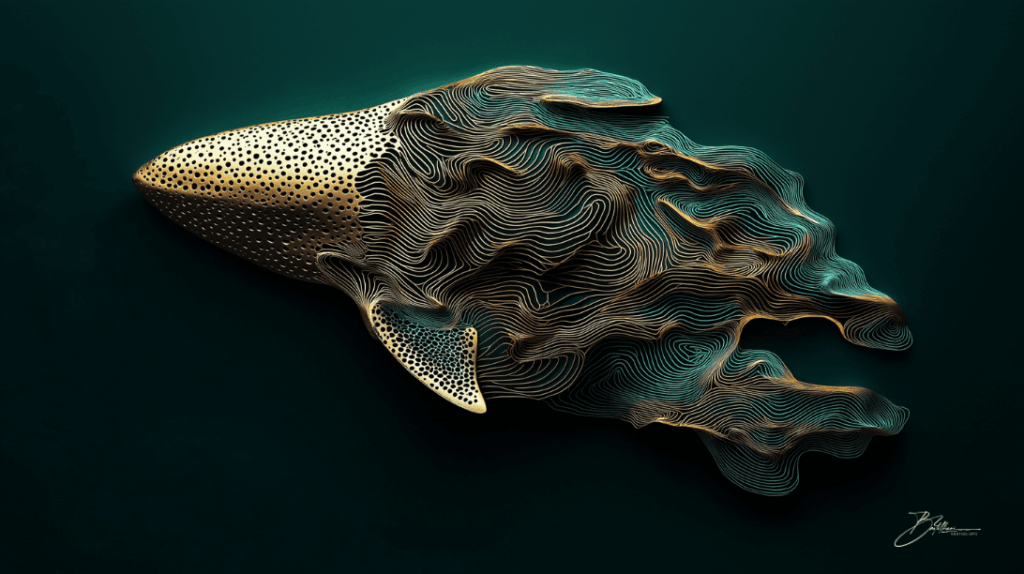 Every coral structure on the whale’s body represents the fragile web of marine life – all that is connected, even if it often remains unseen by human eyes. The golden accents feel precious, almost sacred, yet they also remind us of the value – and vulnerability – of this underwater world.